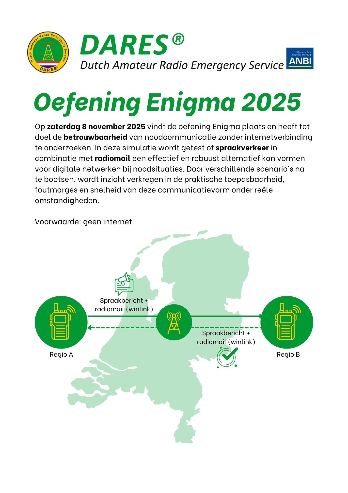 Scenario: In een aantal oostelijke regio’s is door een cyberaanval de energielevering van Tennet weggevallen. Hierdoor ontstaat er in deze regio’s dringend behoefte aan brandstof, medicijnen, voedsel, water, noodaggregaten enz. Het landelijke Dares Landelijk Crisis Centrum (DLCC) in Oegstgeest coordineert de aanvragen. Een aantal buurregio’s verzorgt het berichtenverkeer van/naar het DLCC.
